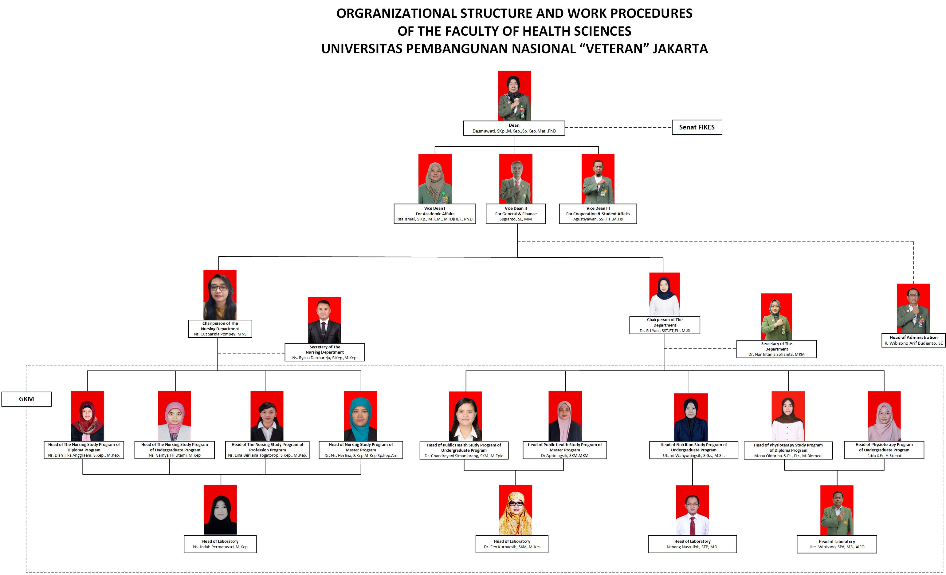 Bagan Struktur Organisasi Fakultas Ilmu Kesehatan Dekanat Fakultas Ilmu Kesehatan Dekan Desmawati, SKp., M.Kep., Sp.Mat., Ph.D. Profile | LHKPN Wakil DekanBidang Akademik Rita Ismail, S.Kp., M.K.M., MTD(HE)., Ph.D. Profile | LHKPN Wakil DekanBidang Keuangan dan Umum Sugianto, S.E., M.M. Profile | LHKPN Wakil DekanBidang Kemahasiswaan, Alumni dan Kerja Sama Agustiyawan, S.ST.FT., M.Fis., Ftr., AIFO. Profile | LHKPN Ketua Jurusan Ketua Jurusan Keperawatan Ns. Cut Sarida Pompey, S.Kep., M.N.S. Profile | LHKPN Ketua Jurusan Gizi, Fisioterapi, Kesehatan Masyarakat Dr. Sri Yani, Ftr., M.Si. Profile | LHKPN Sekretaris Jurusan Sekretaris Jurusan Keperawatan Ns. Rycco Darmareja, S.Kep., M.Kep. Profile | LHKPN Sekretaris Jurusan Gizi, Fisioterapi, Kesehatan Masyarakat Dr. Nur Intania Sofianita, S.I.Kom., MKM Profile | LHKPN Koordinator Program Studi Koordinator Program Studi Keperawatan Program Magister Dr. Herlina, M.Kep, Sp. Kep. An. Profile | LHKPN Koordinator Program Studi Pendidikan Profesi Ners Program Profesi Ns. Lina Berliana Togatorop, S.Kep., M.Kep. Profile | LHKPN Koordinator Program Studi Keperawatan Program Sarjana Ns. Gamya Tri Utami, S.Kep., M.Kep. Profile | LHKPN Koordinator Program Studi Keperawatan Program Diploma Tiga Ns. Diah Tika Anggraeni Tri Utami, S.Kep., M.Kep. Profile | LHKPN Koordinator Program Studi Kesehatan Masyarakat Program Magister Dr. Apriningsih, S.KM.,M.K.M. Profile | LHKPN Koordinator Program Studi Kesehatan Masyarakat Program Sarjana Dr. Chandrayani Simanjorang, S.KM., M.Epid. Profile | LHKPN Koordinator Program Studi Gizi Program Sarjana Utami Wahyuningsih, S.Gz., M.Si. Profile | LHKPN Koordinator Program Studi Fisioterapi Program Sarjana Rabia, S.Ft., M.Biomed. Profile | LHKPN Koordinator Program Studi Fisioterapi Program Diploma Tiga Mona Oktarina, S.Ft.,Ftr.,M.Biomed. Profile | LHKPN Kepala Laboratorium Kepala Laboratorium Keperawatan Ns. Indah Permatasari, M.Kep. Kepala Laboratorium Kesehatan Masyarakat Dr. Een Kurnaesih, S.KM, M.Kes. Kepala Laboratorium Gizi Nanang Nasrullah, S.TP., M.Si. Kepala Laboratorium Fisioterapi Heri Wibisono, S.Pd., M.Si., AIFO Tata Usaha Koordinator Tata Usaha R. Wibisono Arif Budianto, S.E. Sub Koordinator Akademik & Kemahasiswaan Devi Puspa Sari, S.Kom., M.M.